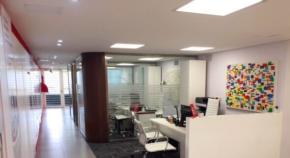 Esta sucursal del Banco Supervielle fue una intervención realizada sobre un local preexistente que había albergado la sucursal de otra red de bancos. La complejidad del proyecto radicaba en transformar tanto la espacialidad como la imagen del edificio para que se adaptara a un nuevo concepto. El recorrido de la planta baja va conduciendo por distintas escalas, desde el sector de espera de clientes en doble altura hasta llegar al sector de cajas, mucho más privado en contacto directo con el patio posterior. El primer piso se plantea como una bandeja abierta que participa del espacio de espera de planta baja.
