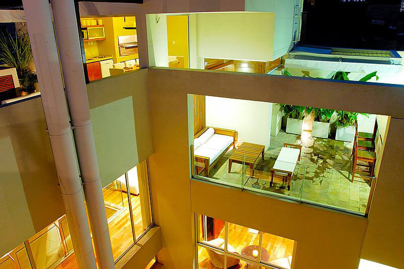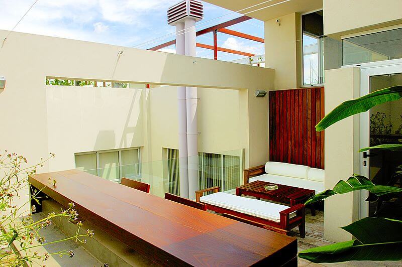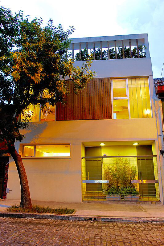 Este proyecto se encuentra ubicado en la Ciudad de Buenos Aires, en el barrio de Palermo. El dueño del lote quería realizar una inversión construyendo una vivienda que posteriormente pondría en alquiler para extranjeros en un mercado cuya demanda en este barrio porteño está en constante aumento. El desafío estaba en articular los espacios y la volumetría en un lote chico, de forma trapezoidal. El partido resultante generaba dos volúmenes, una al frente y otra apoyada en la medianera posterior vinculadas entre ellas a través de un vacío materializado en un patio exterior y en una doble altura interior entre el estar íntimo y el living de planta baja. En planta baja se disponen los espacios públicos (estudio, estar-comedor, cocina) en torno al patio, en el primer piso dos de las habitaciones mientras que en el entrepiso la habitación restante. La terraza aparece como un espacio lúdico al aire libre con solárium, parrilla, pileta desde el cual se puede contemplar la volumetría general del edificio. La fachada, que se presenta como una interpretación moderna de la composición tripartita (basamento, desarrollo y remate), responde fielmente al armado de las plantas: una planta baja más muraria hacia el exterior abierta hacia el patio interno, el primer piso con una tratamiento mixto, combina un revestimiento de madera en un sector, U-glass y carpintería de aluminio según las necesidades; finalmente el remate de la terraza se presenta como la materialización del vacío al que contiene.